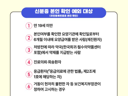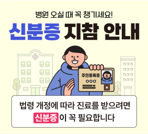 법령 개전 이전에는 주민등록번호만 제시하면 진료를 받을 수 있었습니다.하지만 개정 이후에는 신분증을 꼭 지참하셔야만 합니다!신분증은 주민등록증, 운전면허증, 여권, 국가 보훈 등록증 등이 있습니다.사진이 붙어있고 실제 진료 받으러 오는 사람이 동일한 사람인지 체크를 한다는 것입니다.