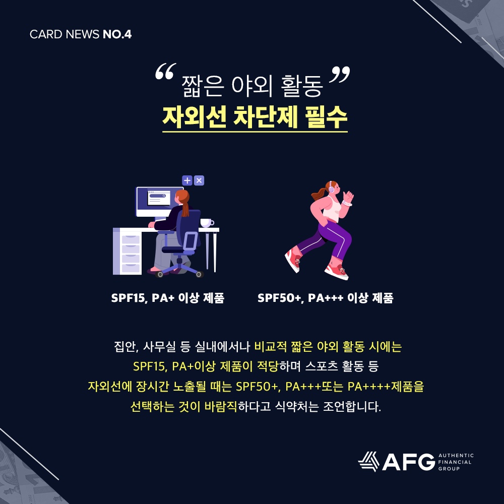 스포츠 활동 이나 장시간 자외선에 노출 될때는 SPF50+, PA+++ 이상 제품을 선택하는 것이 바람직 하다고