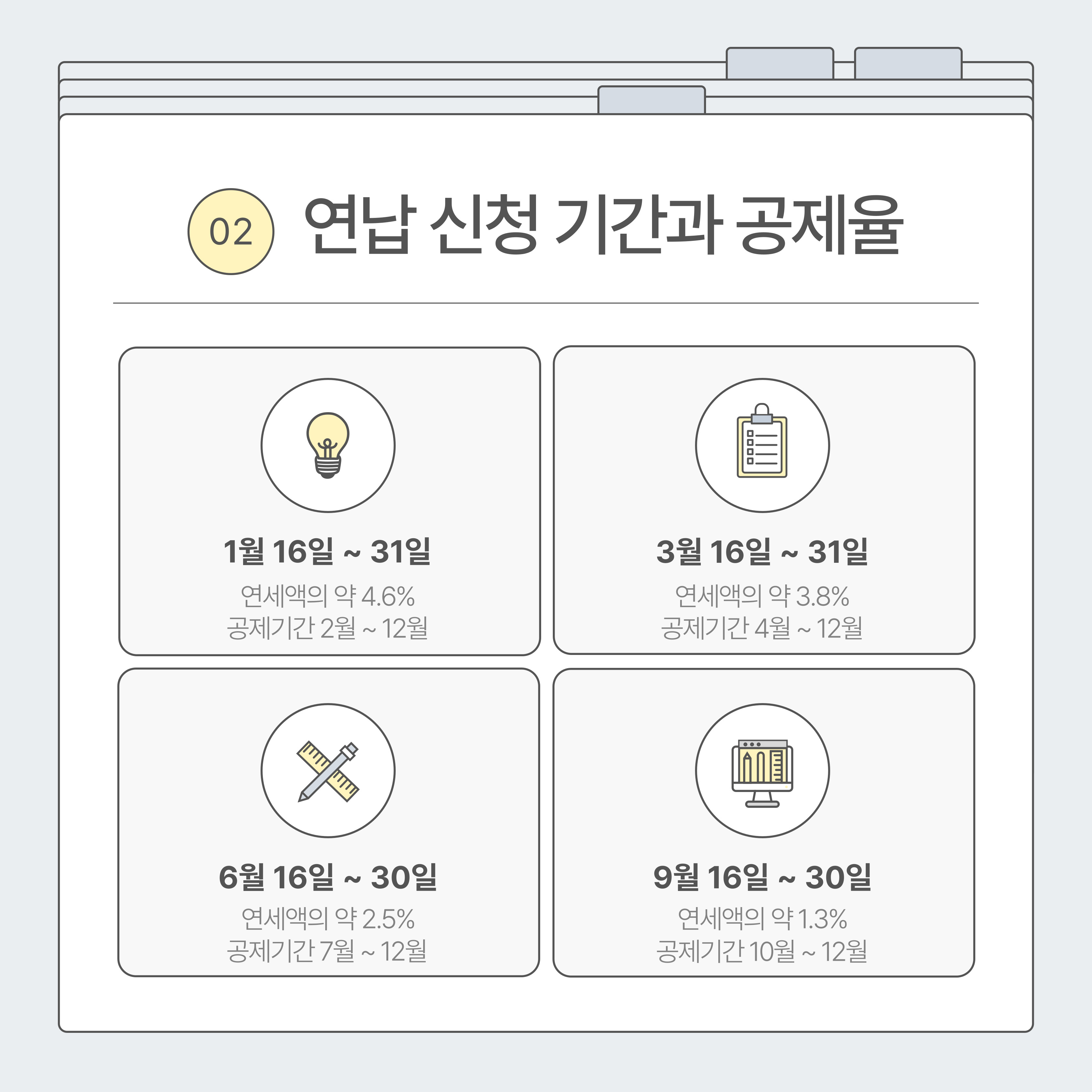 빨리 연납을 할수록 공제금액이 커지니 하려면 빨리해서 하는 것이 좋겠죠??