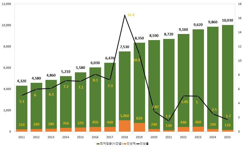 한자리대의 인상률로 계속 최저임금이 인상이 되고 있습니다.